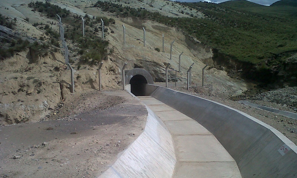 Presa en la laguna Huscacocha, de 16m de altura, capacidad de 115 Hm3.